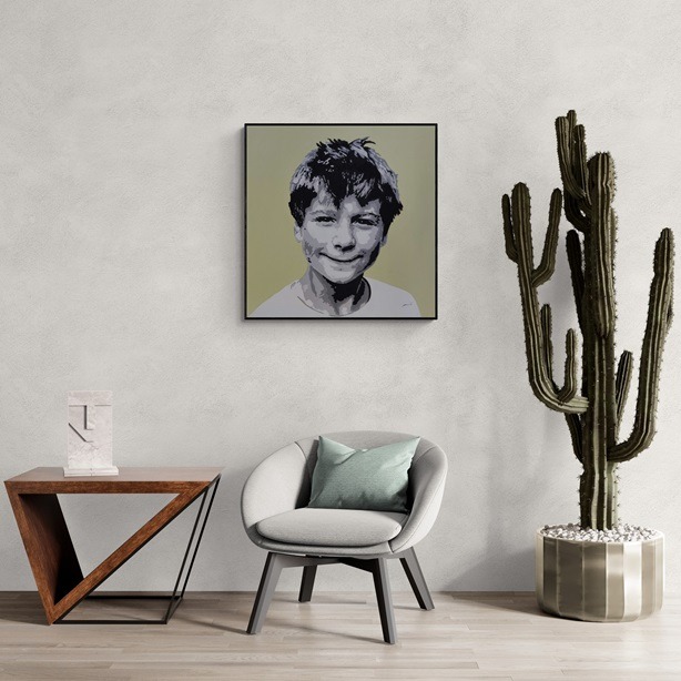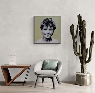 The subject of my work is none other than my talented son, captured in a black and white portrait. This piece is a unique blend of art pop and a nostalgic backward glance, merging contemporary flair with a classic touch.