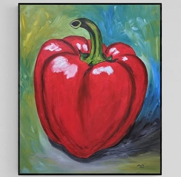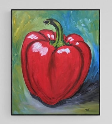 Presenting: "Culinary Canvas" Primed canvas, painted with acrylic—a harmonious dance of peppers, brought to life in a 60 x 50 cm masterpiece. The painting is elegantly finished with a 0.5 cm painted frame.