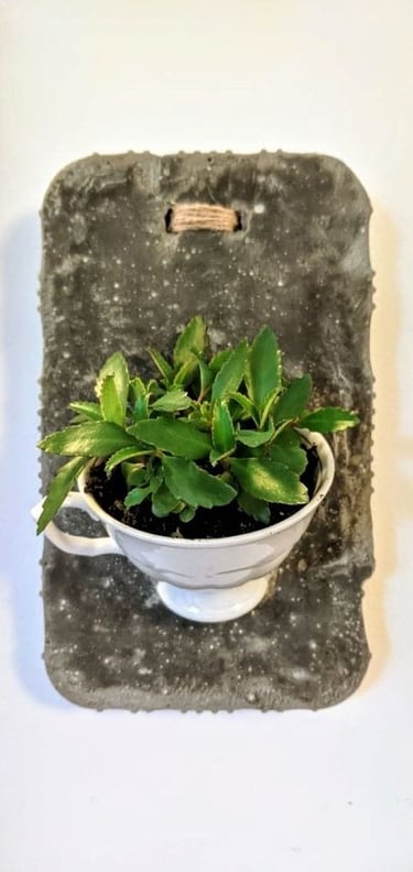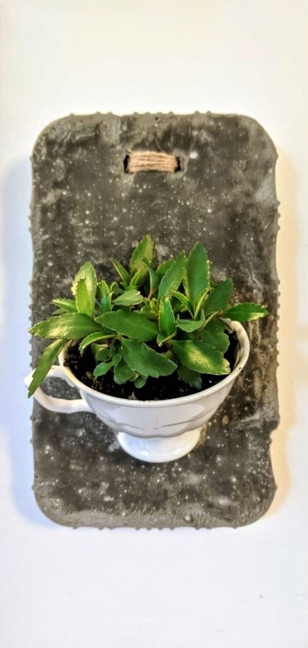 I had one more porcelain cup and craved another wall planter. Completed, hung, and filled with new life.