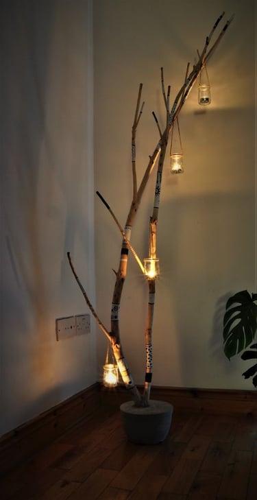 Subtle Light of Harmony: The candle holder conceals glass mini lanterns, casting a gentle glow. Six lanterns, though four are visible in one of the pictures, create a magical aura around the cemented branches.